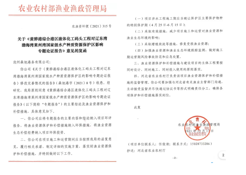 近日,《黄骅港综合港区液体化工码头工程对辽东湾渤海湾莱州湾国家级水产种质资源保护区影响专题论证报告》取得了农业农村部的批复。农业农村部批复的取得加快了液体化工码头工程项目前期手续跑办的进度,为项目开工建设奠定了坚实基础。