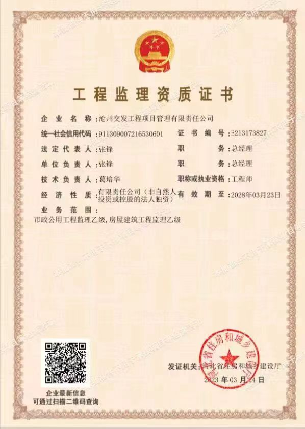 2023年3月24日,经河北省住房和城乡建设厅核准,沧州交发工程项目管理有限责任公司获批市政公用、房屋建筑工程监理乙级资质证书。