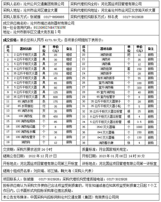 沧州公共交通集团有限公司消防设备采购及维护采购项目成交公告