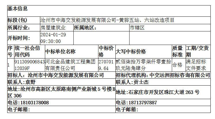 沧州市中海交发能源发展有限公司-黄骅五站、六站改造项目中标公告