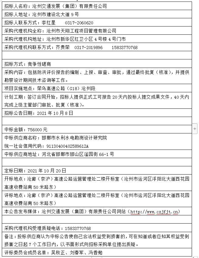 荣乌高速公路(G18)沧州段改扩建工程防洪评价编制单位采购中标公告