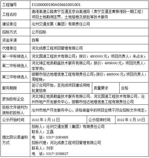 曲港高速公路肃宁互通至京台高速段(肃宁互通至黄骅港段一期工程)项目土地勘测定界、土地组卷及报批等技术服务中标候选人公示