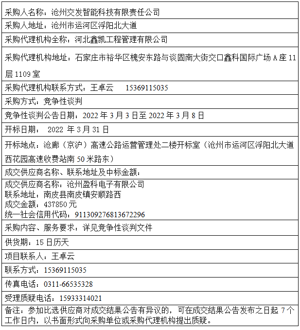 沧州高速公路稽查稽核系统设备采购安装项目 成交结果公告