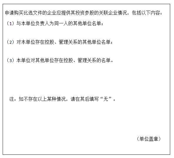 方式:有意向的供应商在比选文件发售时间内,由法定代表人或授权代理人持营业执照复印件(加盖公章)、资质证书复印件(加盖公章)、投资参股的关联企业情况表原件(格式见附件)、购买人的身份证原件、授权委托书(法定代表人亲自购买文件的无需授权委托书)原件,到指定地点报名并购买比选文件。