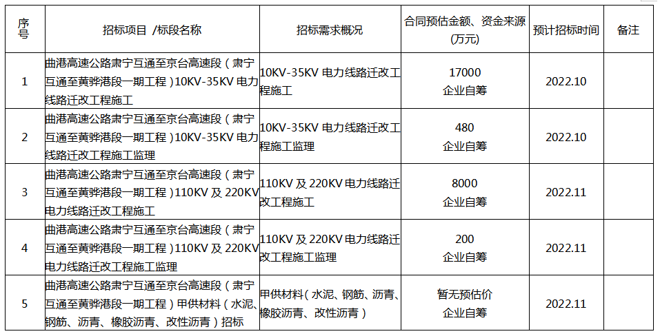 为便于投标人及时了解招标投标信息,根据《关于推动国有企业招标人落实提升招标投标活动质量若干措施工作的通知》 (沧审批字(2021)19号)等有关规定,现将沧州曲港高速公路建设有限责任公司 2022年新增项目招标计划公开如下: